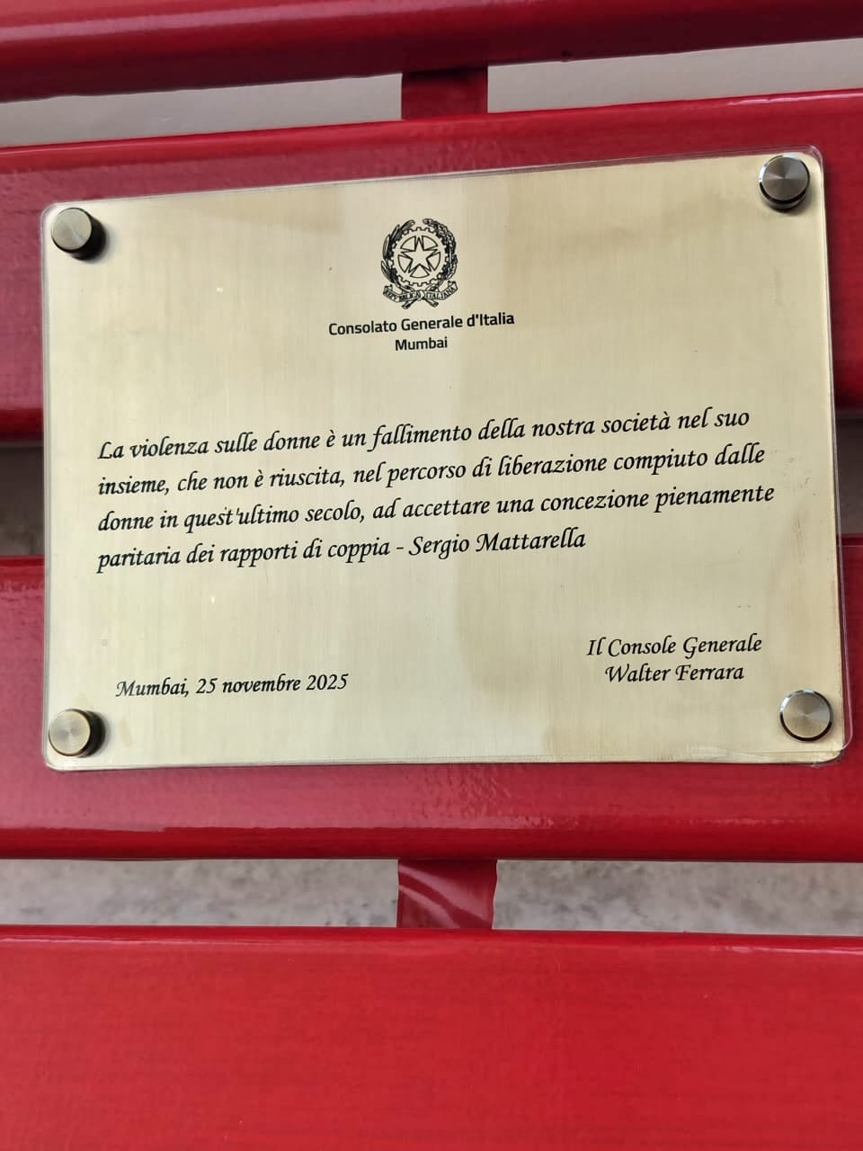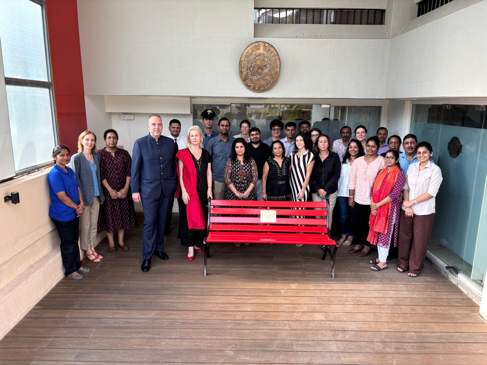 To mark the day for the Elimination of violence against women, on the 25th of November 2025, the Consulate General of Italy in Mumbai joined the initiative of the “Red Benches” where Consul General Walter Ferrara inaugurated the installation of a “Red Bench” in the premises of the Consulate.